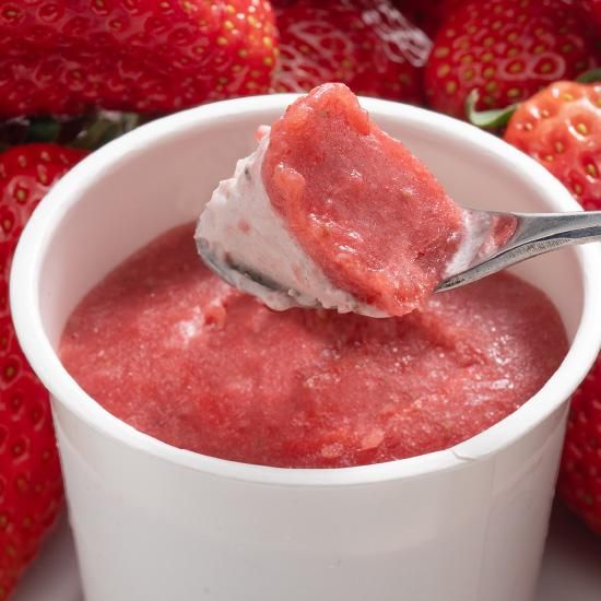 原材料は、いちご、クリーム、練乳、卵のみ。いちごは、須崎市の谷本さんが育てた「紅ほっぺ」。甘味と酸味のバランスが良く、コクがあって、甘みも際立ついちごです。形が崩れたふぞろいの「紅ほっぺ」を贅沢に使って、牛乳や砂糖を入れず、いちご本来の甘さを引き出しています。トッピングのソースは果実を軽くつぶしてつくりました。濃厚な甘みとつぶつぶの食感をお楽しみください。